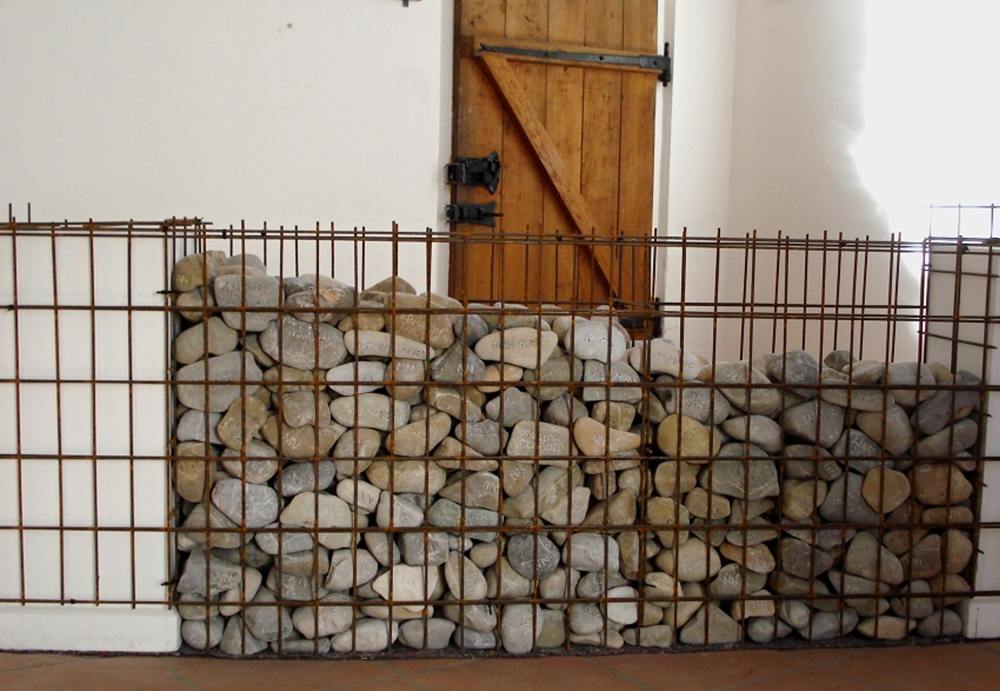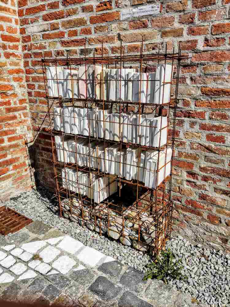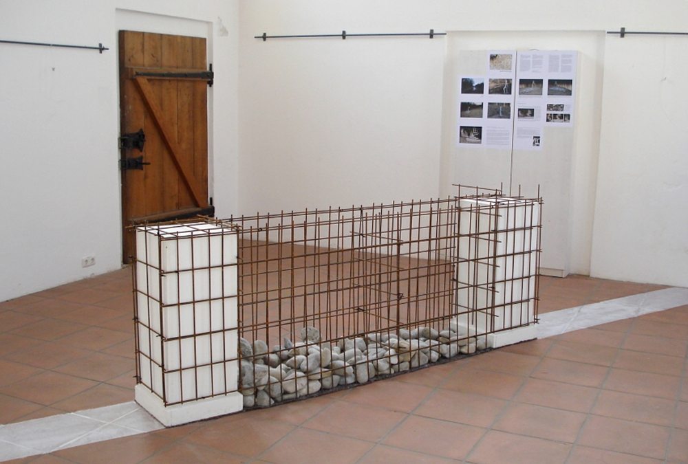 Vor der Kapelle ein Käfig aus rostendem Armierungseisen, gefüllt mit weißen Büchern: „Die Bibliothek der gestorbenen Träume“. Auf der weißen Ost-West-Linie, die sich durch die Kapelle bis über den Orbankai zieht, steht ein Arbeitstisch, an dem ich die unendliche Zahl der Steine graviere mit den Namen der Menschen, die auf der Flucht vor dem schlechten Leben den Tod gefunden haben. Von den meisten ist nicht einmal der Name bekannt. In ihre Steine ist ein NN graviert (no name).