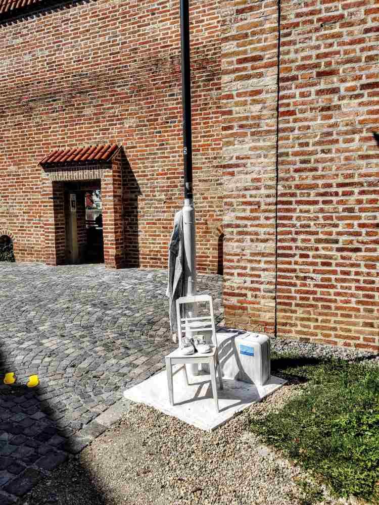 Unter freiem Himmel hängt an einem Laternenpfahl ein Mantel, davor steht schief ein Stuhl, auf dem ein Paar Schuhe abgestellt sind. Daneben ein Koffer. Der Mensch, dem das gehört, fehlt. Wie ein Hoteletikett klebt auf dem Koffer das Foto von einem unspektakulären Blick aufs offene Meer. Das Ensemble könnte auch eine Hommage an die Berber von Landshut sein, die auf ihren Streifzügen durch die Stadt hier im Hof um die Kapelle gern pausieren.
