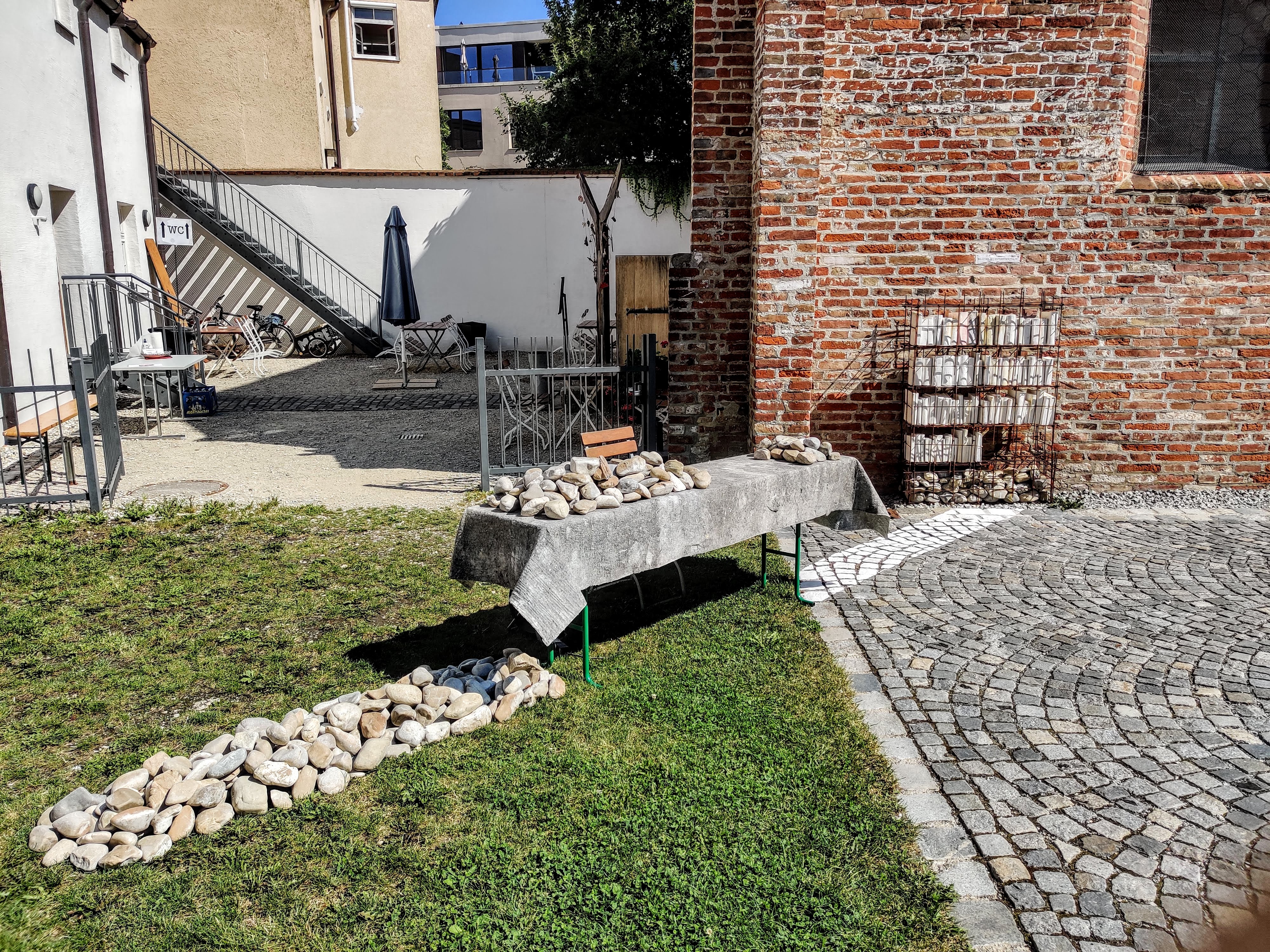 Als "Sisyphos in Landshut" überwintern die Steine im Hof des Rieblwirtes in Landshut.