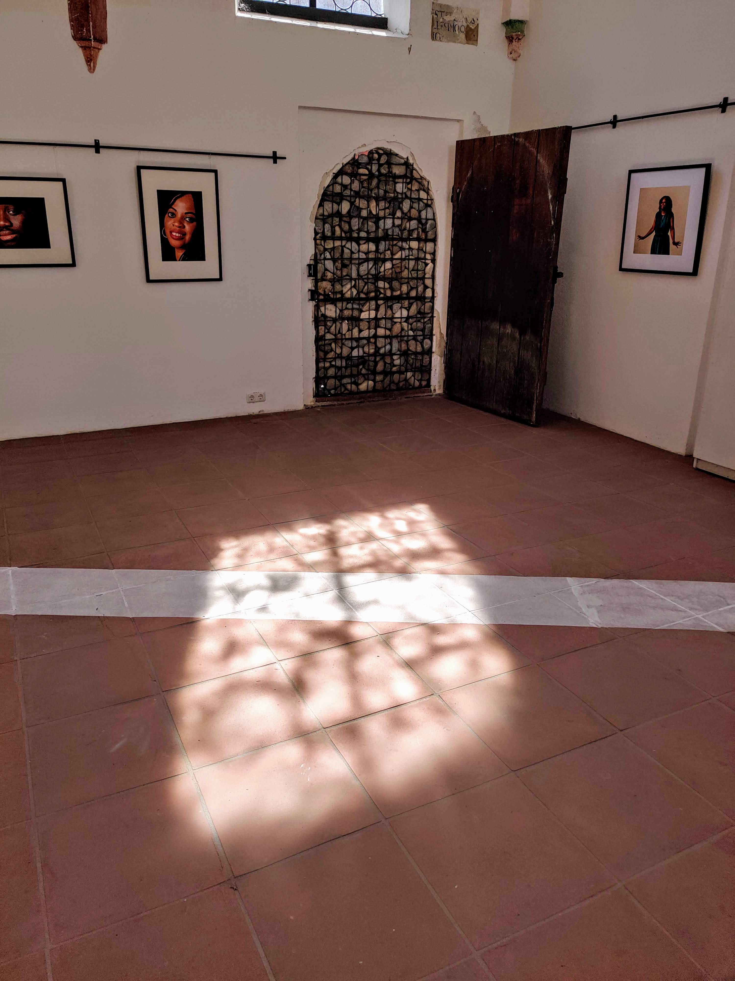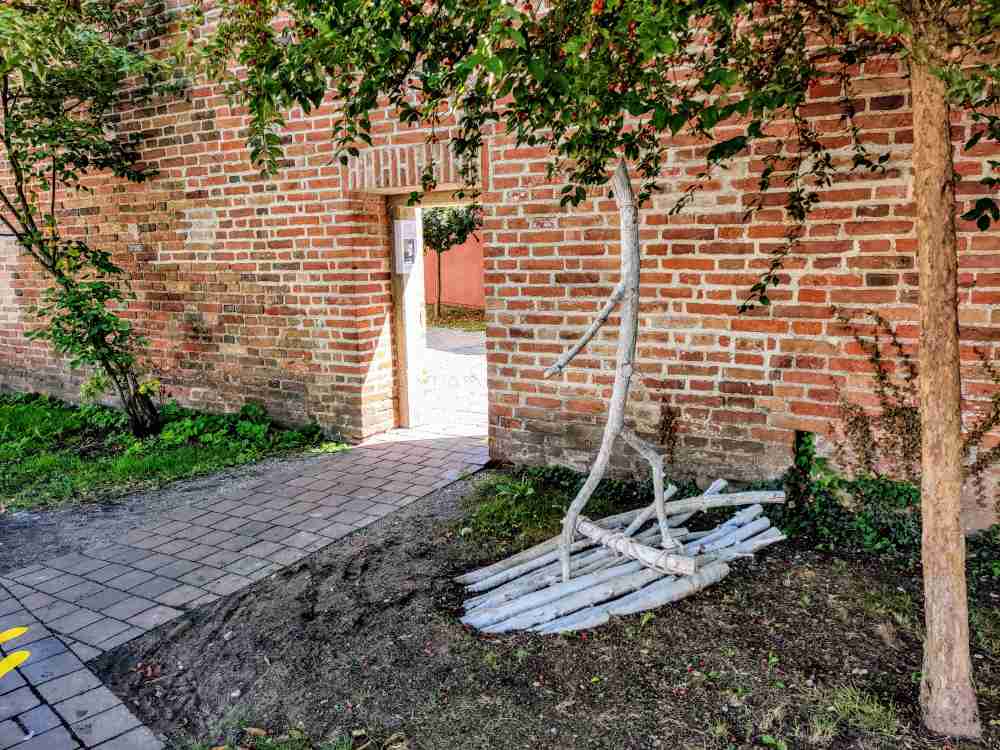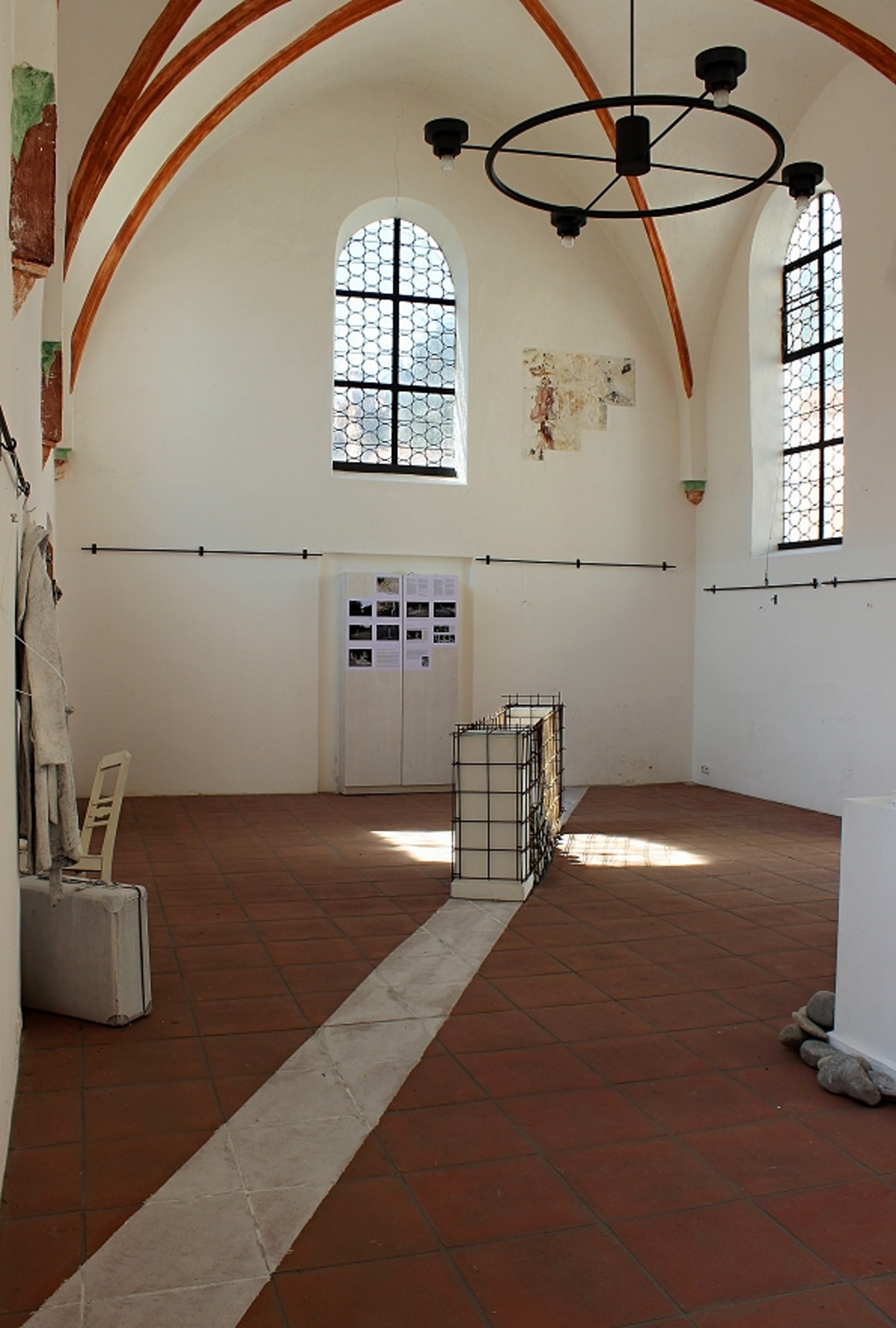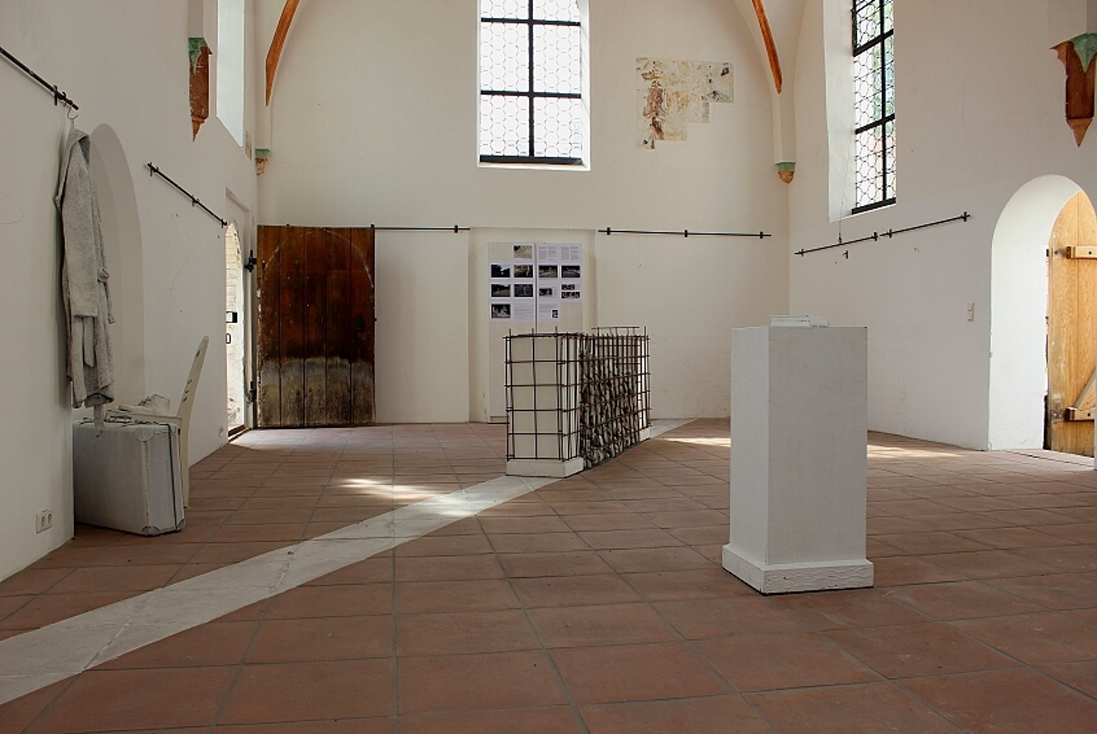 Eine Mauer aus gravierten Steinen versperrt die südliche Pforte der Kapelle, auf die scheinbar eine weiße Figur aus Treibholz zugeht. Man kann das von Außen als Barrikade sehen und von Innen als Schutz der Würde von Frauen, Männern und Kindern, die Thomas Ratjen in seinen Porträts sichtbar macht.