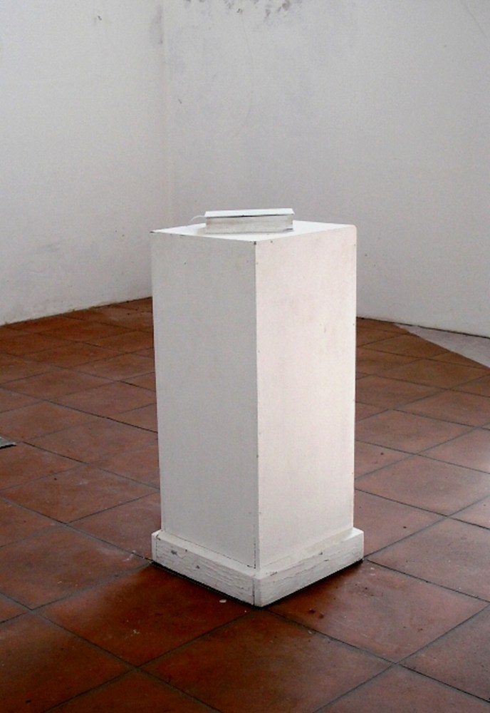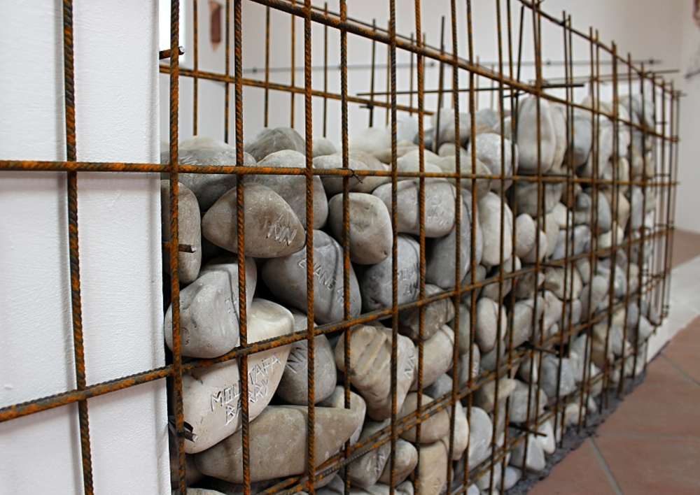Vor der Kapelle ein Käfig aus rostendem Armierungseisen, gefüllt mit weißen Büchern: „Die Bibliothek der gestorbenen Träume“. Auf der weißen Ost-West-Linie, die sich durch die Kapelle bis über den Orbankai zieht, steht ein Arbeitstisch, an dem ich die unendliche Zahl der Steine graviere mit den Namen der Menschen, die auf der Flucht vor dem schlechten Leben den Tod gefunden haben. Von den meisten ist nicht einmal der Name bekannt. In ihre Steine ist ein NN graviert (no name).